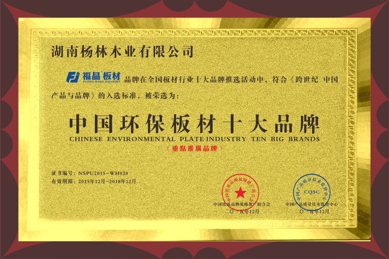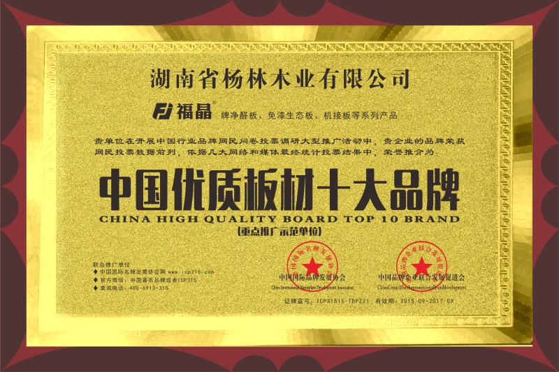 “福晶”牌系列产品,以其平整度好,翘曲可能性小,甲醛释放量低,内在质量优(芯板使用纯湘杉),销售价格合理等优点,被评为: