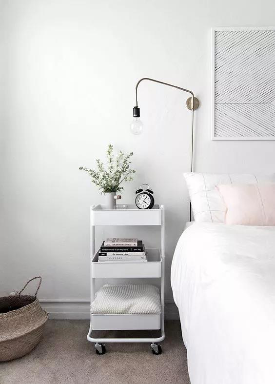 床头柜存在的意义,只是提供给人一个平面放东西。如果你只是需要个地方放手机、充电器、书籍、眼镜等小物,完全没必要花重金买一个带有N层抽屉的床头柜,放个小推车完全能满足使用需求。