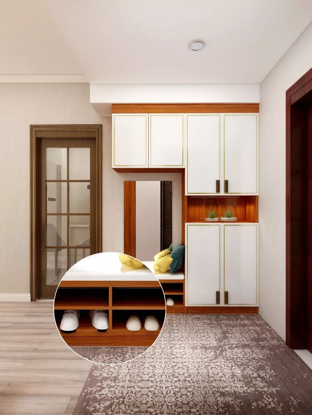 纯白顶地墙和柜门,与红檀色柜体的组合,搭配两小盆绿色,在暖色灯光的衬托下,营造出一个干净整洁,同时富有情调的门厅环境。