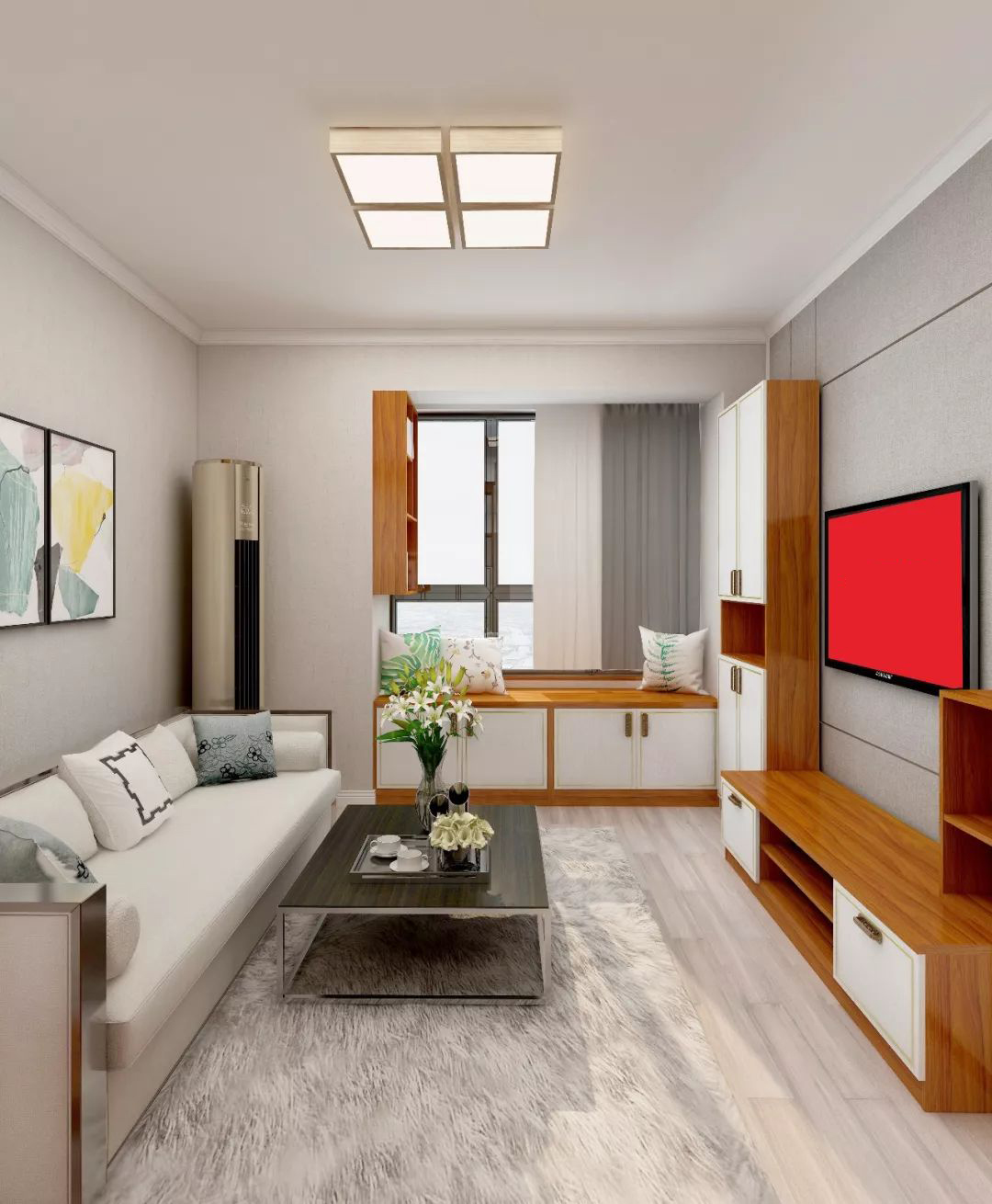 顶部四格灯与大面积的地毯,强调了客厅的中心位置。在浅灰色的大环境中,米白色布艺沙发和红檀木色的家具陈设搭配,让空间环境稳重而又不沉闷,展现出独立而又干练的空间性格。