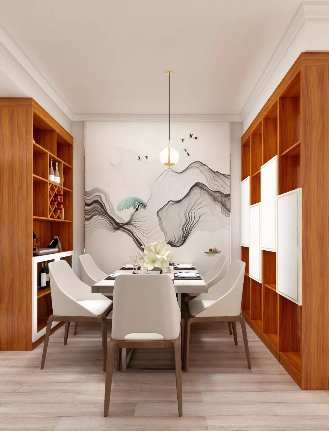 餐厅照明选用高显色的吊灯,使食物看上去更美味,从而增加食欲。搭配满墙的水墨画,更显韵味,吸引着主人在这享受美食带来的愉悦
