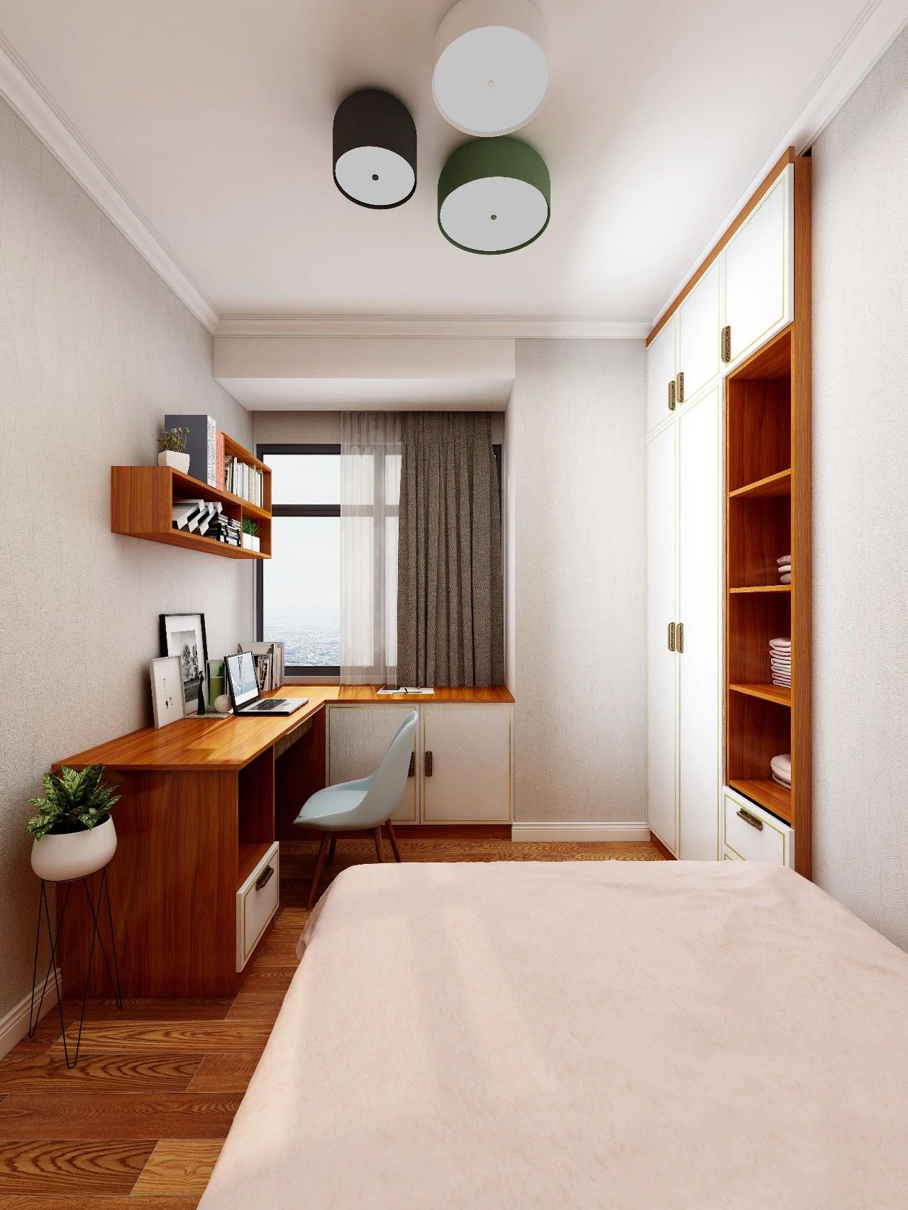 第一个次卧,床头区的整面展示柜上,挂满了主人的画作和物件,强调了卧室的归属感,凸显个性。