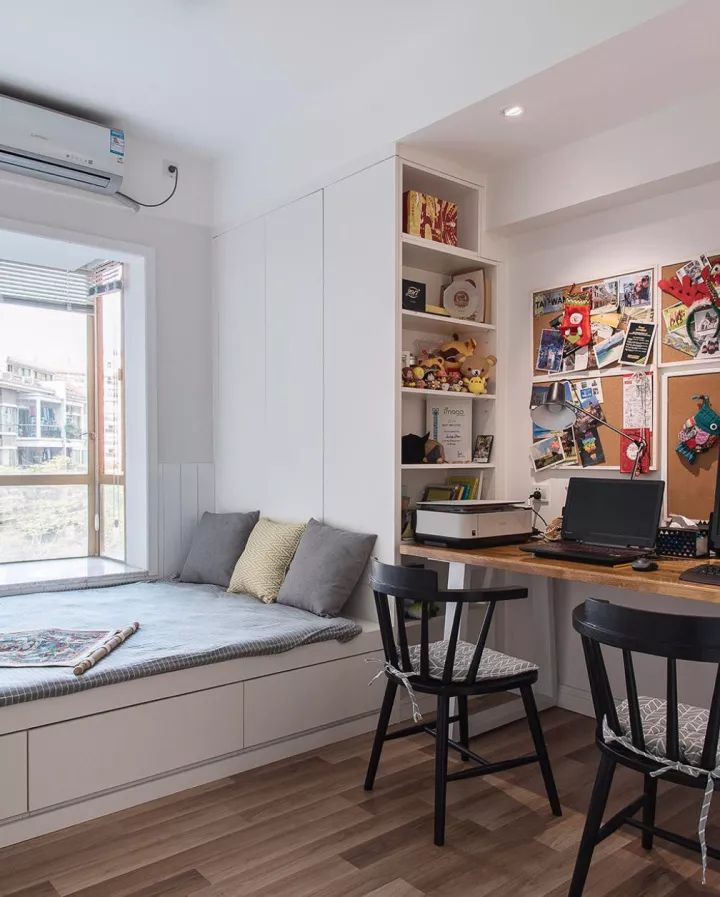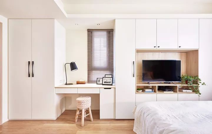 对于小户型而言,在有限的面积内实现自己想要的一些功能是需要花更多心思的。写字台是卧室内比较常见的,柜子更是必不可少的需求。