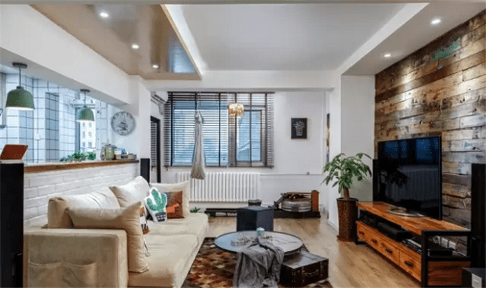因为房间的层高只有两米六,所以只在电视背景墙和沙发的上面做了吊顶,筒灯不仅仅渲染了客厅的气氛,而且增加了空间的层次感,粗旷的电视背景墙成为整个客厅的焦点,复古文艺范十足的木地板搭配简单质朴的沙发,这么温馨的客厅怎么会不招人喜爱呢。