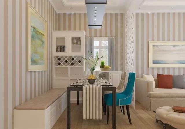 如果感觉吊柜式餐边柜太过于紧凑,小空间里收纳功能更强大的餐边柜也是可以做到的。贴墙的半开放式餐边柜,既可以盛放酒具餐具类,也可以储存日常小物件,总会在某个时候派上用场。