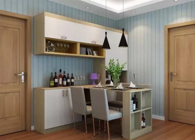 为了充分利用每个角落,餐边柜可以设计成具有科学合理高度的吊柜样式,使用餐区桌柜合一。简单利落,美观大气,拿取物品也方便极了。