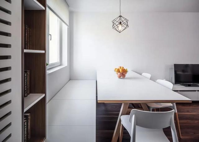 靠近窗户的地方,摆放着简单的餐桌椅,但这并不仅仅只是个用餐区,定制的榻榻米以及书架,让这里也成为一个休闲区。