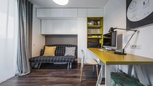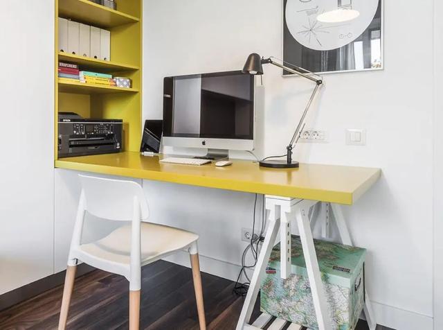 书房的设计,不再是延用客厅简约的色调,而是大胆加入了柠檬黄色调,黄色的抱枕、书架以及书桌,给空间注入了一丝活力,让整体看起来没那么单调沉闷,反而多了一份活泼。