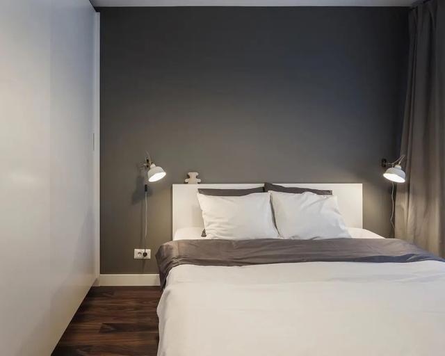 卧室更注重的是舒适,没有多余的装饰,精心挑选的床品,保证日常睡眠质量,简单的两个壁灯,提供日常照明。