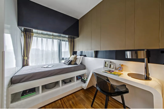 如果以半屋布局榻榻米,那么榻榻米之上可以作为睡眠、休闲、收纳区域,而之下则可作为工作区域,工作、休闲能共处一室但又互不干扰,打造出一个多功能房。