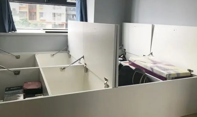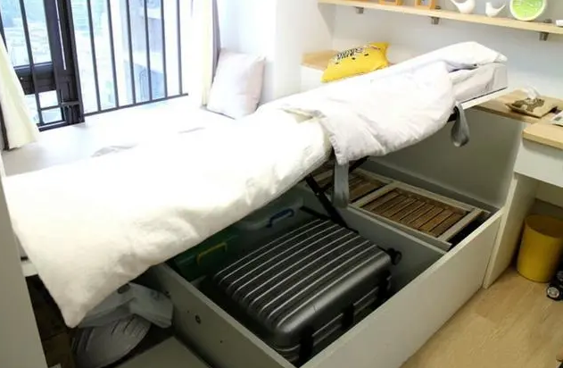 另外靠墙以后,还可以选用更有收纳价值的床,如上图,这种带收纳柜小床。