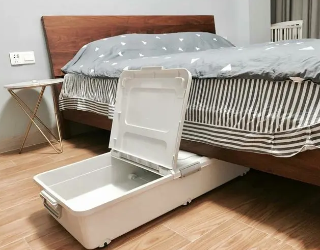 床下没有专门留做收纳的空间,还可以借助这种全封闭式的薄收纳箱,带轮子推拉容易,颜值也很高。