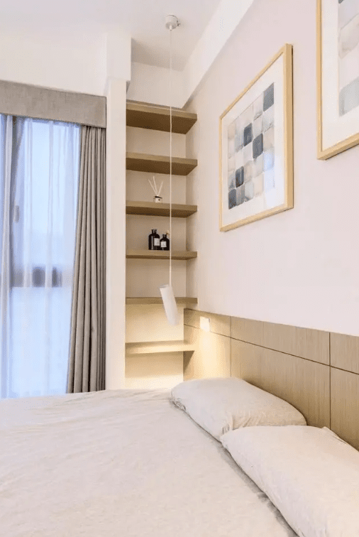 将床头向前移20cm,做成背景收纳柜,可以将卧室的小物件收纳的整洁有序。再搭配灯带,颜值与实用性并存!