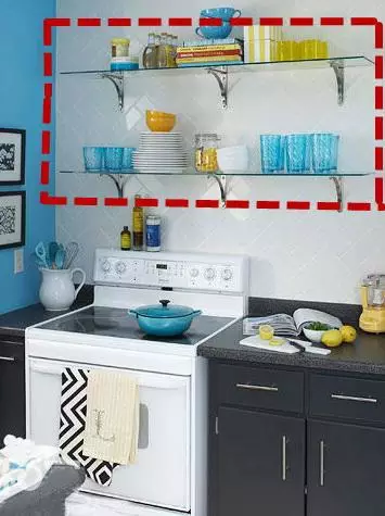 开放性的置物架,可以放置常用碗、盘、筷等物品。其实不是所有的东西都得在柜子里才是最好的,我们厨房中常用的调料盒等东西就应该有一个开放式的置物架,方便,美观两不误。